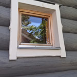 Reilun kokoinen sauna on rakennettu jykevistä kelohirsistä, ulkopuolelta maalattu samalla siniharmaalla kuin päärakennuksen puurakenteet. Käynti saunaan sisäkautta suihkuhuoneesta. Tilaa riittää isommallekin porukalle, ja katetulle terassille on mukava mennä vilvoittelemaan, grillailemaan tai vain chillailemaan.